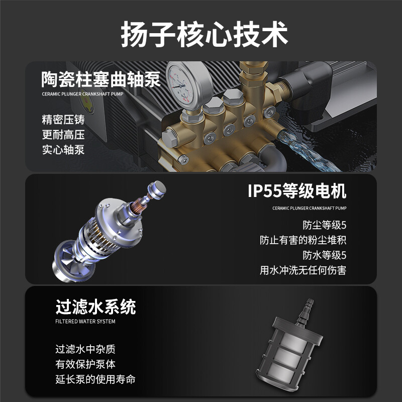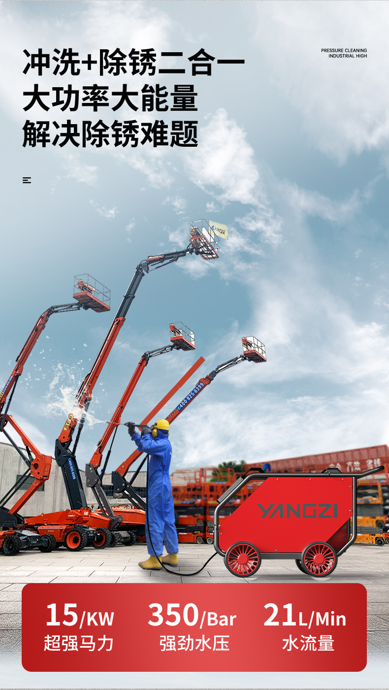揚子YZ35-21E電動高壓清洗機廣泛應(yīng)用物業(yè)小區(qū)、工業(yè)化、城市、酒店后廚等污水管道疏通清洗,沖洗+除銹二合一大功率大能量解決除銹難題